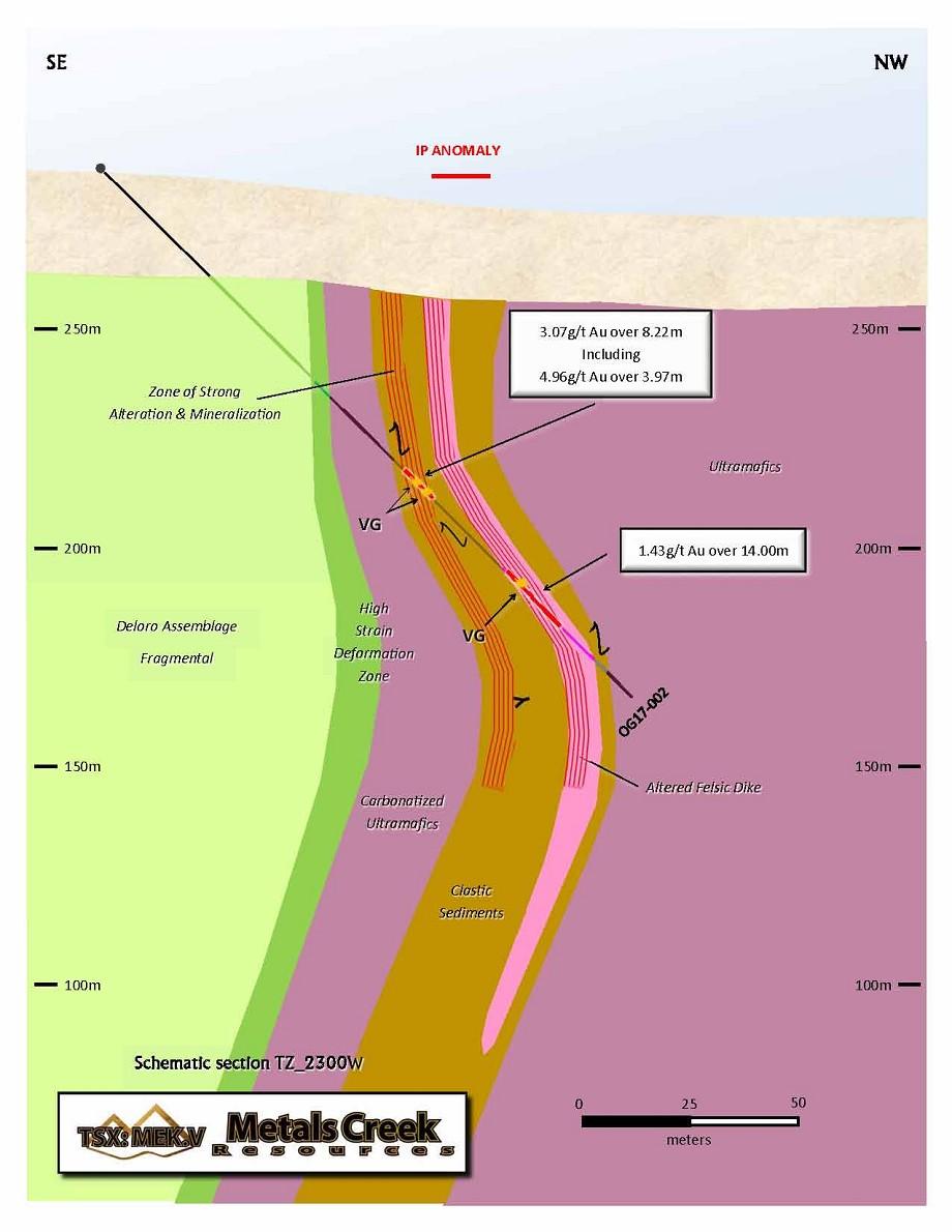 Metals Creek (MEK) and Newmont have formed a 50/50 Joint Venture Agreement on the Ogden Gold Property with Metals Creek as operator. The property is located in Ogden Township and covers over 8 km of strike length on the Porcupine-Destor Break. Gold production to the east of the Metals Creek property has exceeded 22 million ounces from a number of mines including Newmont's Dome Mine, which has produced in excess of 17 million ounces. Five additional past producers occur along the Porcupine-Destor break , between the Dome Mine and the Property that has seen past production ranging from 920,000 oz to 2,502,000 oz. The Naybob Mine is located on the optioned property and has past production of 50,731 oz of gold. (Source: Government of Ontario, MNDM, Gold production in the Timmins Resident Geologist's District 2006)