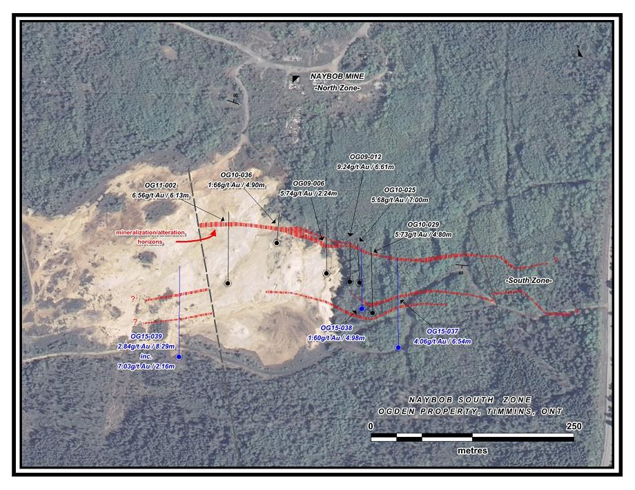 In 2012, the Corporation completed a 11 diamond drill holes on the Thomas Ogden Zone. Highlights over the 2012 program include 6.08g/t Au over 21.85m including 11.76g/t Au over 9.00m (TOG-12-03) and 9.46g/t Au over 18.55 (TOG-12-07). These diamond drill holes were beneficial in advancing the Corporations understanding of the complex geology and the structural controls on gold mineralization at the Thomas Ogden Zone. The gold mineralization is associated with alteration zones within porphyry dikes and timiskiming sediments. The allteratin zones consist of strong albitization and silicifications, with varying amounts of pyrite and arsenopyrite mineralization and visible gold. Both drill intercepts are within 150m of surface and remain open to the west and at depth.
